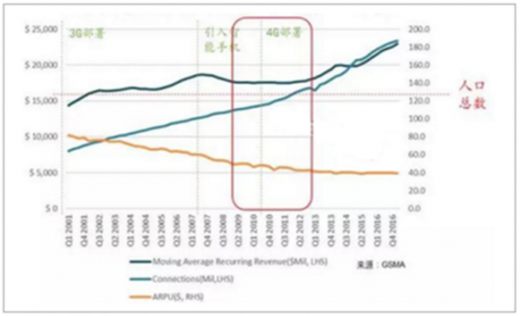 通信运营行业收入增长严重依靠用户数增长,全球电信行业的技术创新都在围绕解决用户来源的问题而努力,而每一代新的技术的商用,也都是以用户规模作为主要发展衡量指标。这一规律在美中日韩的通信发展历程中得到了验证。中国和美国运营商的经常性收入以服务收入为主,趋势最为显著。运营商的经常性收入增长几乎和用户数增长一致,运营商的收入增长几乎完全由用户数增长驱动的。当用户数接近人口之后,运营商收入增长将会面临压力。
