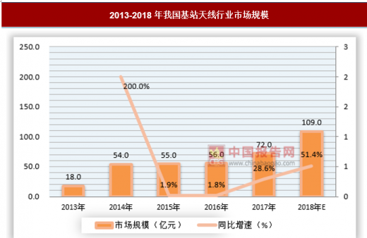 2013年被认为是我国4g元年,4g牌照于2013年年底正式发放,我国基站天线市场规模在2014年迅速增长,随后几年增长放缓,2017年达到72亿元左右,随着5g的部署,预计未来我国基站天线又将迎来一波高增长,2018年行业市场规模将突破百亿。