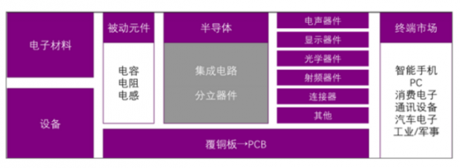 半导体位于电子行业的中游,上游是和设备。半导体和被动元件以及模组器件通过集成电路板连接,构成了、pc等电子产品的核心部件,承担信息的载体和传输功能,成为信息化社会的基石。
