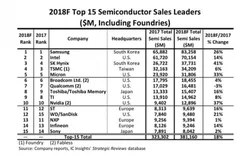 报告显示,预计2018年前15家半导体公司的销售额将比2017年增长18%,比预期的全球半导体行业2018/2017增长16%高出两个百分点。三星,sk海力士和美光这三大内存供应商预计2018年的同比增长率将超过25%,预计sk海力士今年的销售额将激增41%,有望成为全球15大供应商中增长最快的一家。预计今年所有前15家公司的销售额至少将达到80亿美元,相当于比2017年增加两家公司。另外预计2018年排名前15位的公司中有9家将实现两位数的同比增长;此外,有五家公司的增长率将达到20%以上,其中包括四家大型存储器供应商:三星、sk海力士、美光、西部数据/ sandisk,还有nvidia。