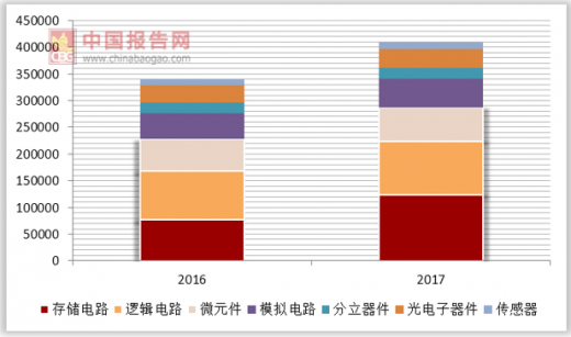 2017年世界半导体市场规模为4086.91亿美元,同比增长20.6%,首破4000亿美元大关,创七年以来(2010年为年增31.8%)的新高。其中,集成电路产品市场销售额为3401.89亿美元,同比增长22.9%,大出业界意料之外,占到全球半导体市场总值的83.2%的份额。存储器电路(memory)产品市场销售额为1229.18亿美元,同比增长60.1%,占到全球半导体市场总值的30.1%,超越历年占比最大的逻辑电路(1014.13亿美元),也印证了业界所谓的存储器是集成电路产业的温度计和风向标之说。