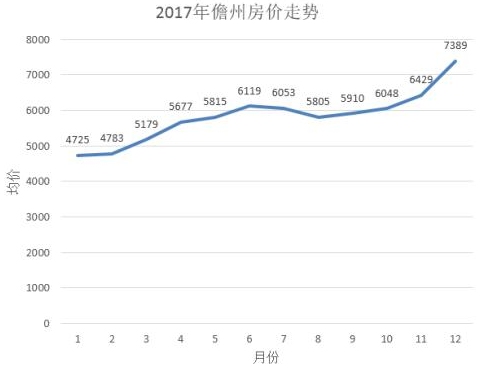 根据安居客数据显示,儋州房价从2016年1月的4493元/平米直线上升到2017年12月的7389元/平米,涨幅超过60%。2015年就是温吞吞的窄幅震荡,基本位于4200到4600之间。