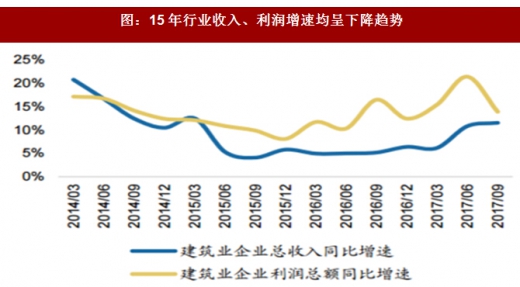 2016年一季度起,随着固定资产投资增速下降幅度收窄,建筑行业回暖,整体 新签订单增速回升。2017年前三季度,全行业新签合同额为16.68万亿元,同比增长 22%,比去年同期增速提高了5.30个百分点。