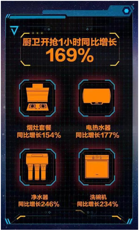 其中,烟灶套餐同比增长154%,电热水器同比增长177%,净水器同比增长246%,洗碗机同比增长234%,可见消费者对厨具产品的热情之高。
