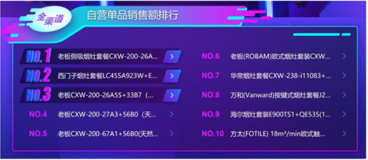 截至今日上午9点40分,苏宁双十一悟空榜烟灶套餐品牌销售额的榜首被老板占据,可见这个老牌家电对消费者的吸引力;在单品销售额排行方面,老板不仅拿下第一和第三名,更有创下5款单品入选的表现,成为烟灶套餐分类的绝对王者。
