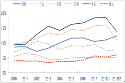 2018年一季度,由于春节错位,装修旺季与2017年同期比相对较晚,品牌普遍销量出现下滑。美的、万和、海尔顺势发力,油烟机零售量市占率分别达12.41%、5.21%、6.05%,同比增长0.69、0.27、1.72pcts,其中美的油烟机零售量市占率于2018年2月首次超越方太,位居市场第二;燃气灶市场,美的、万和零售市占率分别达12.97%、7.27%,同比增长0.67、1.06pcts,美的燃气灶零售市占率超越方太、老板,位居市场top1。