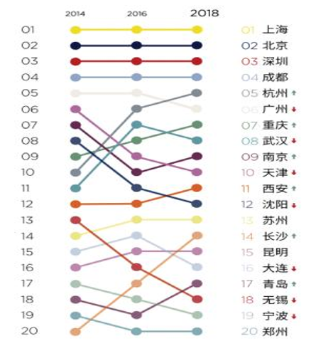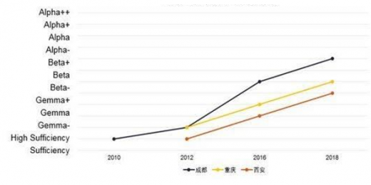 其中,成都的城市层级跃迁最为显著,2016年连升四级从2012年的high sufficiency进入beta-层级,2018年再升两级进入beta 城市行列,由此成为过去四次gawc评选中上升速度最快的城市,并且在中国大陆城市中排名仅次于北京、上海、广州和深圳四大一线城市。
