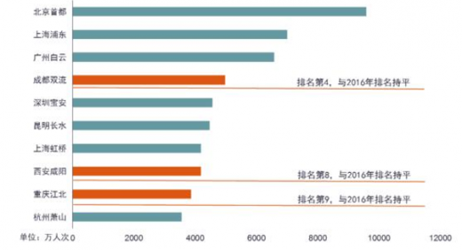 于基建而言,成都在国际航空枢纽的建设表现尤为突出,不仅三大指标位列全国第四,且国际旅客吞吐量是北上广之后唯一突破500万人次的城市。