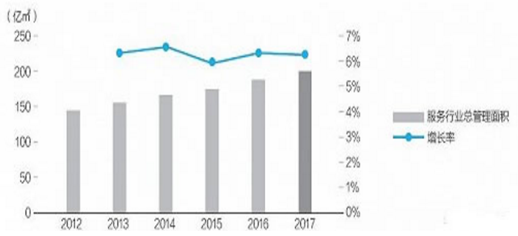 近年来,随着“互联网 ”等新技术的发展和社区经济的兴起,物业服务企业不断整合社区物业资源,拓展和丰富社区服务,提升服务质量和价值,在发展社区经济中的价值凸显。物业管理行业已成为潜力巨大的现代服务业之一,物业服务企业正向现代社区综合服务商发展。全国物业企业管理的物业总面积稳步提升。从2012年至2016年,全国物业管理总面积从145.3亿㎡起,增加了近40亿㎡,达到185.1亿㎡,增幅为27.4%。2017年底,国内继续新增管理物业面积约11.5亿㎡,总管理面积达到196.6亿㎡。