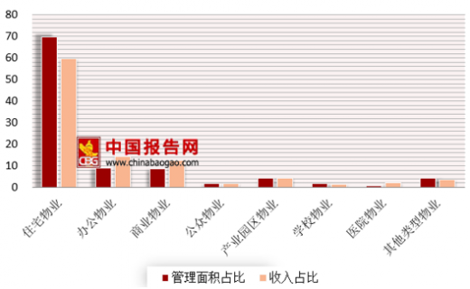 物业服务行业除了传统的住宅物业外,还有众多其他物业类型,如办公物业、商业物业、园区物业、公众物业、学校物业、医院物业等。目前,住宅物业仍占据着物业服务行业的绝大部分。2017年,百强企业住宅物业管理面积占总管理面积的69.85%,住宅物业服务费收入占百强企业基础物业服务总收入的59.72%。