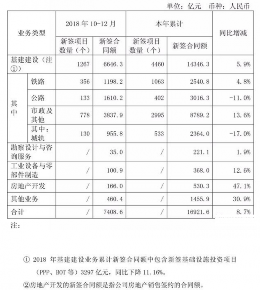 根据资料显示,2018年中国中铁基建建设新签项目数量4460个,新签合同额14346.3亿元人民币。其中在铁路领域新签项目数量1063个,新签合同额2540.8亿元人民币。公路领域新签项目数量402个,新签合同额3016.3亿元人民币。市政及其他域新签项目数量2995个,新签合同额8789.2亿元人民币。