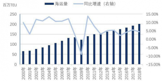2018年世界经济总体延续增长态势。根据数据显示,2018年全球集装箱海运量为2.01亿teu,较2017年同期增长4.46%。