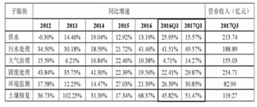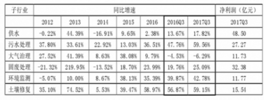 污水处理业绩增速提升明显,大气治理业绩同比继续下滑。从各子版块业绩情况来看,污水处理、土壤修复和环境监测净利润增速位列前三位,其中污水处理业绩增速提升最为明显,同比增加59.56%,相比2016年前三季度提升了约12个百分点。子行业中,大气治理子版块是唯一业绩下滑的板块,净利润同比下降6.29%,降幅比去年同期增加了近2个百分点。回顾2017年前三季度来看,虽然今年是大气十条考核年,但大气治理的思路已经从末端治理转向前端预防,更多的方式转向工业停限产和煤改电、煤改气等能源的变化,因此更多侧重末端治理设备和运营的大气治理企业收益程度较小。