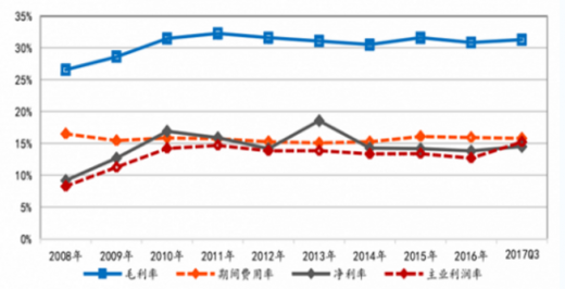 行业利润水平高位稳定。2017年前三季度环保行业整体毛利率为31.27%,同比小幅下降0.41个百分点;净利率为14.51%,同比下降0.1个百分点。虽然非环保企业逐步开展环保类业务后,行业竞争情况有所加剧,但由于行业空间足够大、子行业较多以及特许经营制度,企业间竞争呈现一定差异化特征,因此行业毛利率和净利率均能保持高位稳定状态。