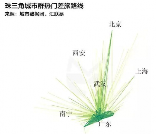 珠三角的大量出行都集中在珠三角沿线地区,尤其是广东省沿海地区。除此之外,最明显的是沿京广线的差旅出行,是珠三角与省外地区联系度最强的路线。