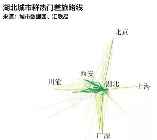 湖北城市群在差旅出行的联系上更偏向于省内出行,以武汉为核心,省内向西的联系度比向东的更强。