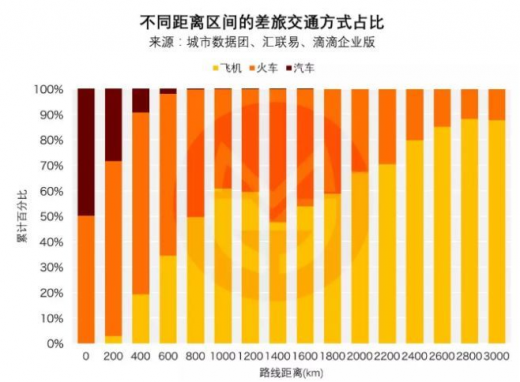 在200公里以下的短距离差旅路线中,汽车和铁路各占据半壁江山;