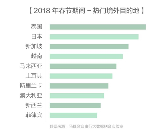 春节期间,反季游是出境游热门主题,中国游客青睐的目的地仍主要集中在温暖的东南亚地区。结合在线旅游者通过携程app、网站和携程线下门店预订大数据和马蜂窝数据,春节出境游最热门国家是泰国、日本、新加坡、越南、马来西亚。携程预定的其余热门的境外目的地还有印尼、菲律宾、柬埔寨、美国、意大利;马蜂窝其余热门的境外目的地还有土耳其、斯里兰卡、澳大利亚、新西兰和菲律宾。