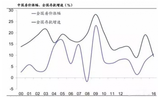 房地产:在城镇化进程推进、房价持续升温的背景下,房地产吸引家庭大量资金流入,家庭收入中投向房产的比例大大超过存款配置。2016年和2017年,居民贷款增量连续超过存款增量,开始由资金供给方转变为资金需求方。从下面这幅房价涨幅和全国存款增速叠加图中可以看到,在2000-2016的16年间,中国的存款增速一直在整体上保持着高于房价增速的水平,直到2016年开始出现逆转——存款增速开始低于房价涨幅。部分银行业内人士认为,在2016年末推出的“限购”、“限贷”政策下,银行提高首付贷款比例,会使购房家庭付出更多首付款资金,甚至会因“限购”而无法从银行融资而不得不选择全款买房。所以,房地产调控政策的挤出效应及房价上涨预期的存在,也消耗了大量居民储蓄存款。