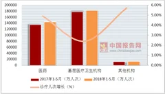 据国家统计网数据显示,2018年1-5月全国医疗卫生机构总诊疗人次达33.8亿人次,同比提高4.3%。医院14.4亿人次,同比提高6.6%,其中:公立医院12.3亿人次,同比提高4.9%;民营医院2.1亿人次,同比提高17.5%。卫生机构18.2亿人次,同比提高2.4%,其中:社区卫生服务中心(站)3.1亿人次,同比提高10.0%;乡镇卫生院4.3亿人次,同比提高3.6%;村卫生室诊疗人次7.5亿人次。其他机构1.3亿人次。