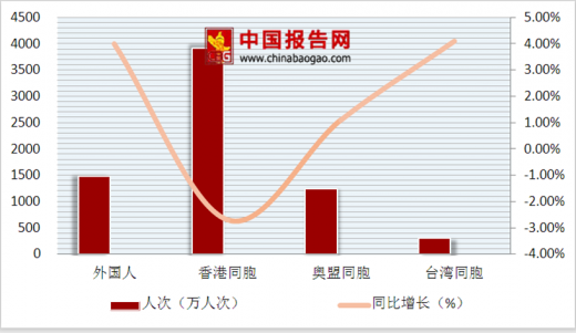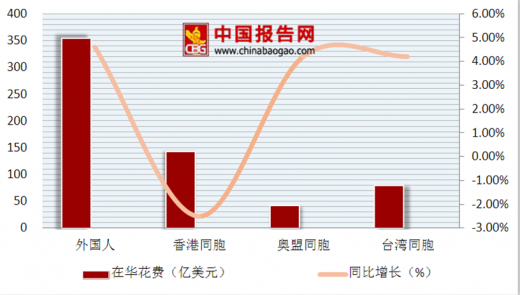 2018年上半年,国际旅游收入达618亿美元,比上年同期增长2.8%;入境旅游人数6923万人次,比上年同期下降0.4%。外国人在华花费最高达354亿美元,增长4.6%,人次达1482万人次,增长4.0%;其次是香港同胞在内地花费142亿美元,下降2.5%,人次3908万人次,下降2.7%。