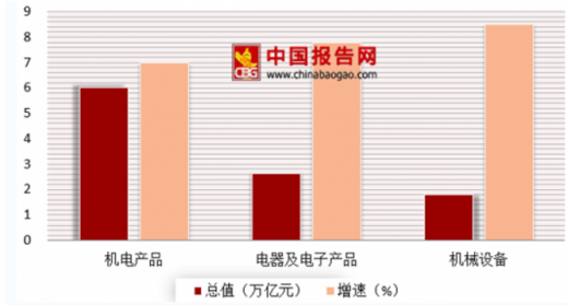 2018年1-8年我国机电产品出口6.01万亿元,增长7%。其中,及出口2.64万亿元;机械设备1.82万亿元。