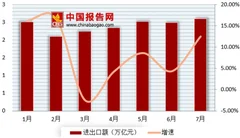 根据数据显示,2018年1-7月我国进出口总额16.72万亿元人民币,比2017年同期增长8.6%;其中出口8.89万亿元,比2017年同期增长5%;进口7.83万亿元,比2017年同期增长12.9%;贸易顺差收窄30.6%。在7月本月,我国进出口总额2.60万亿元,比2017年同期增长12.5%;其中出口1.39万亿元,比2017年同期增长6%;进口1.21万亿元,比2017年同期增长20.9%;贸易顺差收窄42.6%。