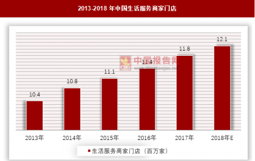 近年来我国生活服务商家门店数量保持快速增长,截止2017年门店数量已经达到11.8万家,预计2018年将达到12.1万家。具体如下:
