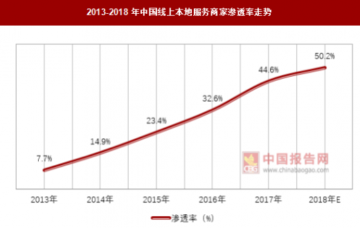 同时,由于互联网的高速发展,线上本地服务商家的渗透率保持快速增长,2013年渗透率仅为7.7%,2017年已经达到44.6%,预计2018年将超过一半。具体如下: