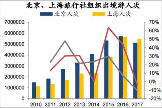 出境游行业兴起以来,通常先将出境旅客集中在京沪等一线城市,再统一组织出境;因而京沪等出发旅客高速增长。随着二三四线城市出境游客的增加,二三线城市国际航线开通数量增加,通过京沪旅行社出境的外地旅客势必会减少。2017年,北京、上海两地旅行社组织出境游人数均同时首次出现负增长;2017年上半年,赴欧洲游人群在二线城市和四线城市实现了同比80%和77%的高增长,其中二三线城市的市场占比超50%。