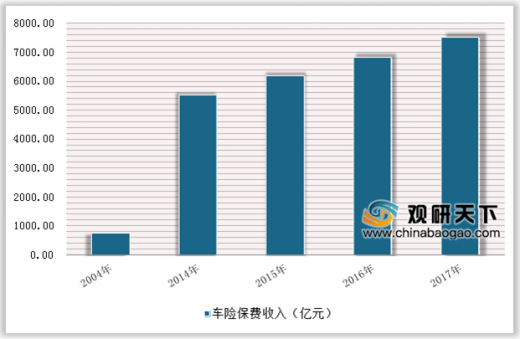 车险作为我国第一大财产险,2016年在我国财产保险中占比为74%,车险占比远高于美国、英国、日本等发达国家。在此背景下,我国车险保费规模从2004年的746亿上升到2017年的7521.07亿元,增长速度较快。