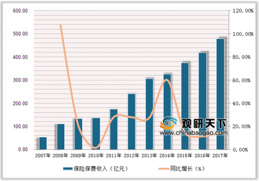 根据国家统计局数据,截至2016年底,我国播种面积为1.67亿公顷,粮食产量为6.16亿吨,进口1.15亿吨,粮食自给率为84.31%,低于90%,有一定的粮食供给风险,保护农户利益、提高农户生产积极性变得尤为重要,农业保险市场空间广阔。自2007年农业保险财政补贴试点以来,我国农业保险潜力得到进一步释放,农险保费收入从2007年的53.4亿元上升到2017年的479.1亿元,年化复合增长率为24.53%,增速稳健。