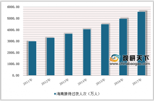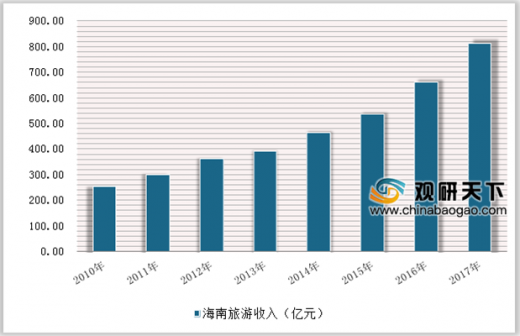 近几年,海南着力提升旅游国际化水平,旅游市场开发取得积极成效;狠抓旅游市场现代治理,规范旅游秩序取得新突破,全省旅游经济发展质量效益显著提升。2013年海南旅游总收入仅428.56亿元,5015年突破500亿元,此后两年海南旅游收入高速增长,2016年海南旅游总收入突破600亿元,达到672.1亿元,比上年增加100亿元,同比增长17.4%。。2017年旅游总收入再创新高,突破800亿元,达到811.99亿元,增速突破20%。五年时间,海南旅游总收入增长89.5%。