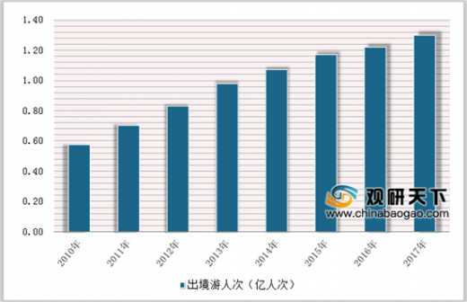 2017年,国内旅游市场高速增长,根据国家旅游数据中心披露的数据显示,2017年国内旅游人数50.01亿人次,比上年同期增长12.8%;入出境旅游总人数2.7亿人次,同比增长3.7%;全年实现旅游总收入5.40万亿元,增长15.1%;初步测算,全年全国旅游业对gdp的综合贡献为9.13万亿元,占gdp总量的11.04%;全年人均出游次数达到3.7次。