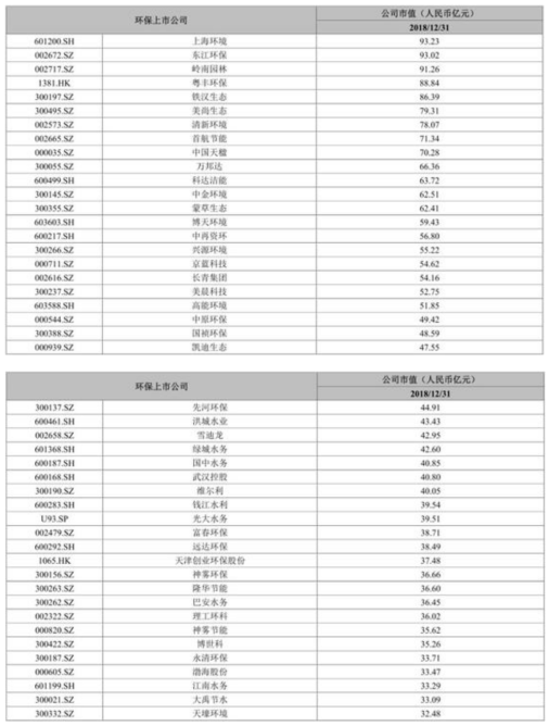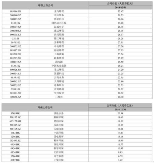 2018年环保上市公司市值top10排名情况
