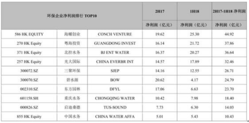 2017下半年-2018上半年环保上市企业净利润排名情况