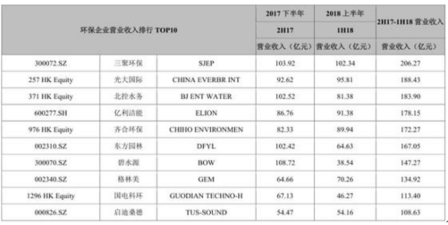 2017下半年-2018上半年环保上市企业营业收入排名情况
