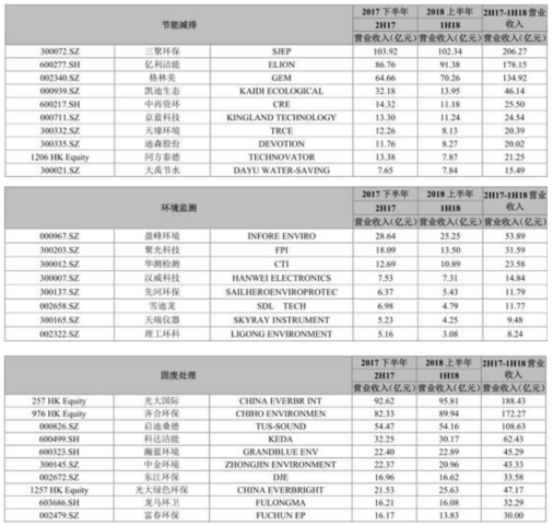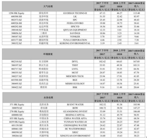 2017下半年-2018上半年环保上市企业细分领域营业收入排名情况