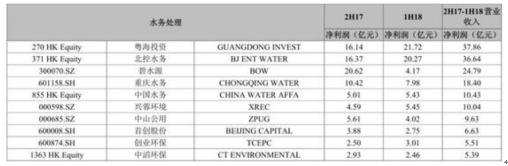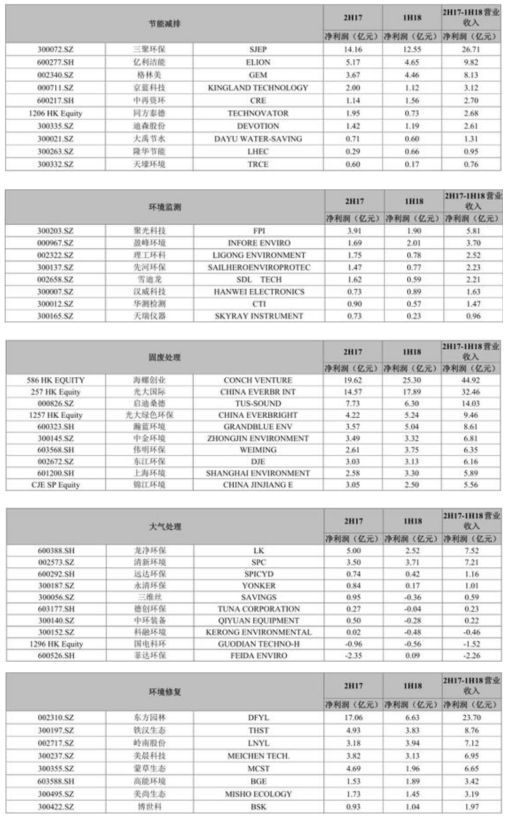 2017下半年-2018上半年环保上市企业细分领域净利润排名情况