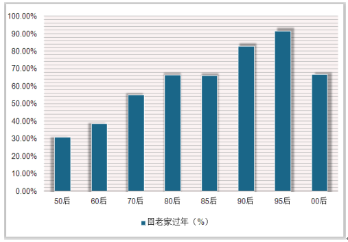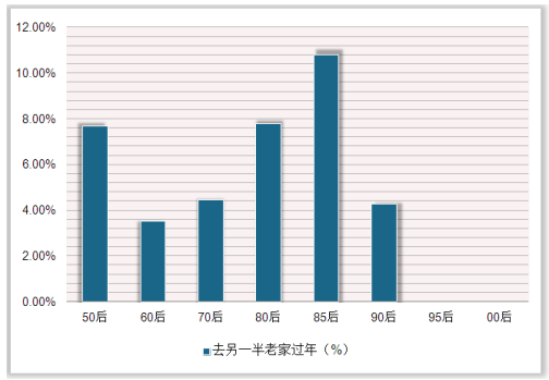 根据调查中发现,年纪越小的人,春节期间越热衷于回老家过年。其中95后有91.53%选择回老家过年,80后(不含85后)中这一人群则占66.42%,50后则更少,仅30.77%会选择回老家过年。年纪越大的人群中,选择外出旅游过年的比例也越高。