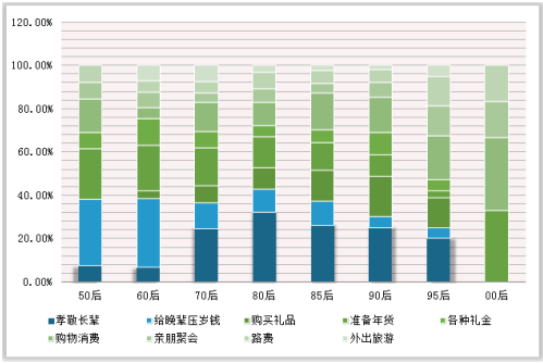 出现这一现象,或许与年纪越长的人,在外定居的人群越多有关。从消费支出的情况看,37.06%的受访者表示春节预计消费超万元。其中70后仍然是春节消费的主力,有45.55%的70后在春节期间预计消费超万元,甚至还有5.48%的人预计消费超过5万元。而初入职场的95后们消费能力也已经凸显,有11.86%的95后都表示自己春节预计消费将超万元,还有3.39%的人预计消费超过5万元。