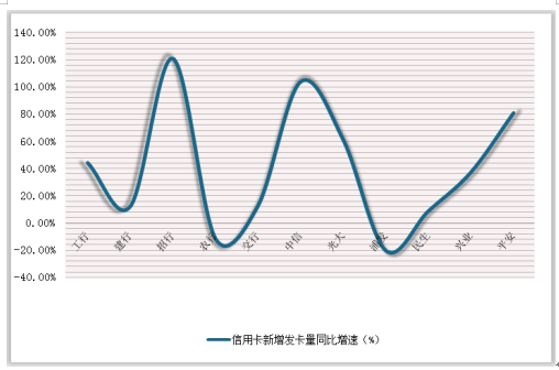 新增发卡量方面,则是招行最高,上半年发卡量1421万张,同比增长121.34%,发卡量和增长率均位居首位;除了招行外,中信银行新增发卡量的增长速度也翻了一番,增长率达104.25%,新增863.27万张。