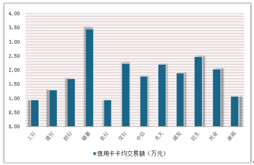 从卡均交易额来看,上半年,邮储银行遥遥领先,为3.45万元;民生、交行、光大和兴业也在2万元以上;浦发、中信和招行位列第三梯队,卡均交易额在1.5-2.0万元之间;工行上半年的总交易额虽然排名靠前,但由于其累计发卡量远高于其他银行,平均下来卡均交易额不足万元,和农行并列最低。
