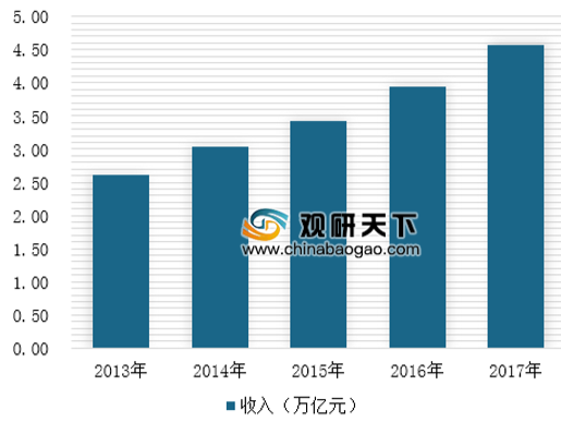 根据数据显示,2013-2017年国内旅游总收入也在逐年增加,2017年中国国内旅游总收入已经达到4.57万亿元,随着旅游用户的不断增加,旅游产业欣欣向荣。