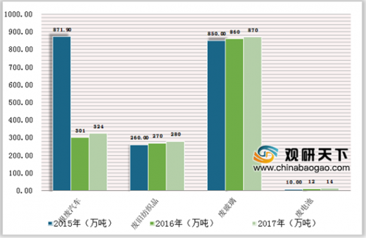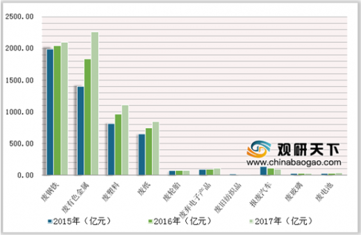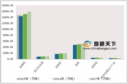 截至2016年底,我国废钢铁、废有色金属、废塑料、废轮胎、废纸、废弃电器电子产品、报废汽车、废旧纺织品、废玻璃、废电池十大类别的再生资源回收总量约为2.56亿吨,同比增长3.7%。随着经济步入“新常态”,需求增速放缓,预计2017年我国再生资源回收总量将稳中有升,再生资源价格将有所提高。