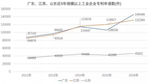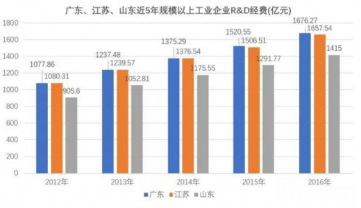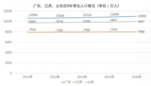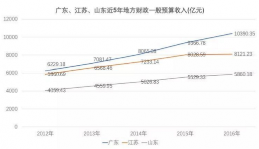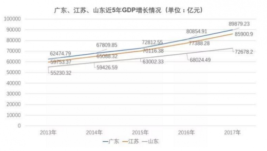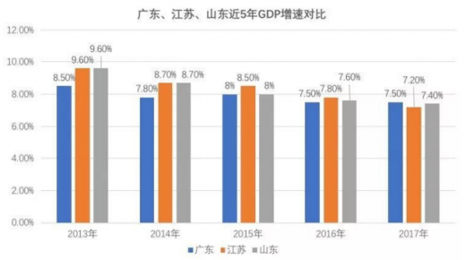 不过,从2015年开始,广东开始发力,渐渐缩小了与江苏、山东的差距,2017年,广东经济增速快于江苏和山东。