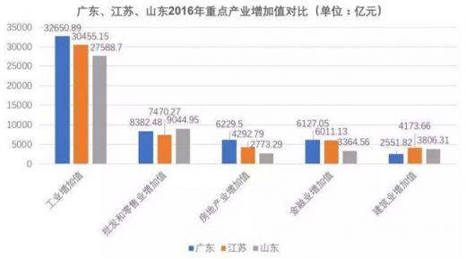 从上图可以看出,2016年,除了批发和零售业,山东工业、房地产、金融、建筑业增加值都小于广东或江苏。