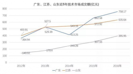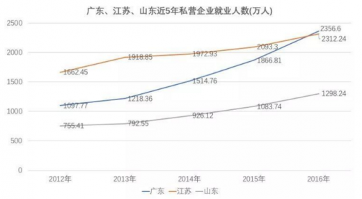 从上图可以看出,广东、江苏的民营企业就业人数远远多于山东,而且广东这几年增速很快,已经在2016年超过了江苏。