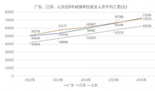 但是,山东和前两省的差距就比较大了,年平均收入大概差10000元,而且差距在拉大。