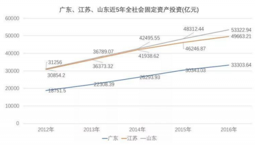 和广东、江苏比,山东在固定资产投资方面领先,这可以得出两个结论: